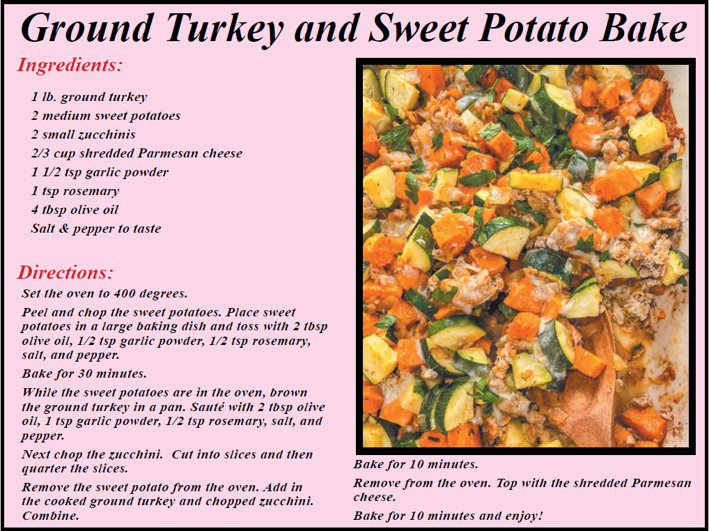 This week’s recipe is an easy-peasy casserole. With ground turkey and sweet potatoes, it is hearty for those cold winter nights but packed full of nutrients. Everyone in your family is sure to love this delicious meal.