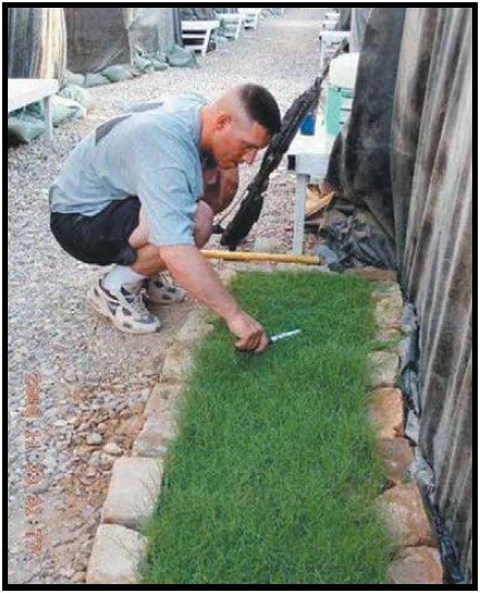 As I was cruising through my email, I came across a picture of a soldier cutting some grass outside his tent with some scissors.  The man is Army, in his PTs, (the casual shorts and T shirt uniform that the soldiers run or work out in,) and he was outside squatting before a makeshift planter that was made from rough Iraqi brick.  His weapon is, according to orders, within arm’s reach off to his left, ever at the ready.
