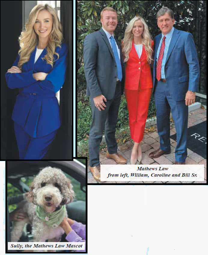 When Caroline Mathews of Mathews Law was an undergrad at Auburn, she majored in English literature and minored in studio art. She was a National Merit Presidential scholar, made the Dean’s List and won several other awards. Caroline had grown up around law all her life, and had worked part time as both a runner and an intern for her dad, Bill. In high school she was a cheerleader and ran track, and was an active member of the youth group at Lindsay Lane Baptist Church. However, there came a time when she knew she had been called to the practice of law, and went ahead and enrolled in law school at the University of Alabama. She is a rare one in our town, having been a grad of two rival schools, and it is probably a good thing that her résumé includes being certified as a mediator!