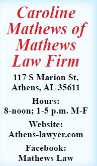 I asked Caroline why I should choose her as an attorney, and I liked the fact that she took her time before she answered. “First of all,” she said, “if your case is in Limestone County you need a local lawyer that knows the area and the people.” “Second, I work with family. My dad has practiced law for decades and he took my brother and me under his wing. He is always there for me, and our family is close,” she added. “Third, I have lived in Athens all my life, and this is where I plan on staying. I love it, I make connections easily, and I care about people,” said Caroline. If this combination of roots, wings, love, and proficiency are what you are looking for in an attorney, then Caroline Mathews of Mathews Law is ready, willing, and able to be your advocate in as well as out of the courtroom. Give their office a call today at 256-232-2310 for an appointment.