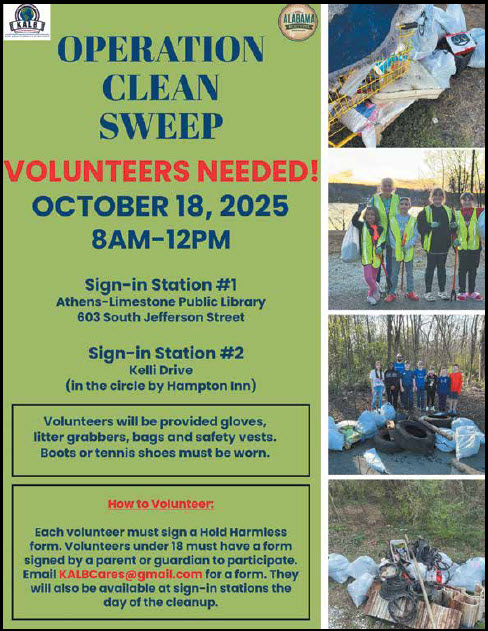 Last year, Athens-Limestone Tourism won the bid to host the Alabama, Mississippi, Tennessee Rural Tourism Conference, which will be October 20-22. They will be hosting around 250 people from other states and counties to highlight some of Athens and Limestone County’s coolest attractions. This conference will be based downtown, and in an effort to look our very best, we are hosting a city cleanup! Operation Clean Sweep will be on October 18, from 8 a.m.-noon. Since we have a lot of ground to cover, we will have two different sign-in stations, one on Kelli Drive off Highway 72, and one at the Athens-Limestone Public Library.