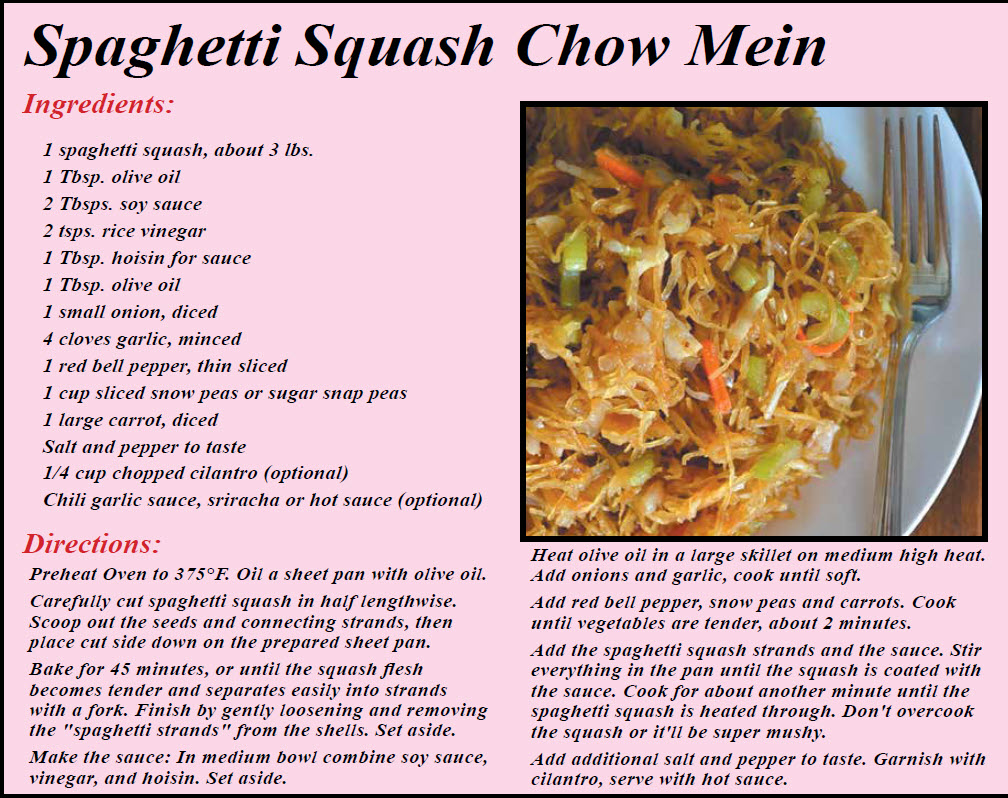 This week’s recipe is one of my favorite types of food. I love all types of Asian food and this spaghetti squash chow mein is not only delicious, but it is also a great healthy alternative. I love to add chicken to this dish, but shrimp is also delicious as well as ground pork. I hope you enjoy it as much as my family does.