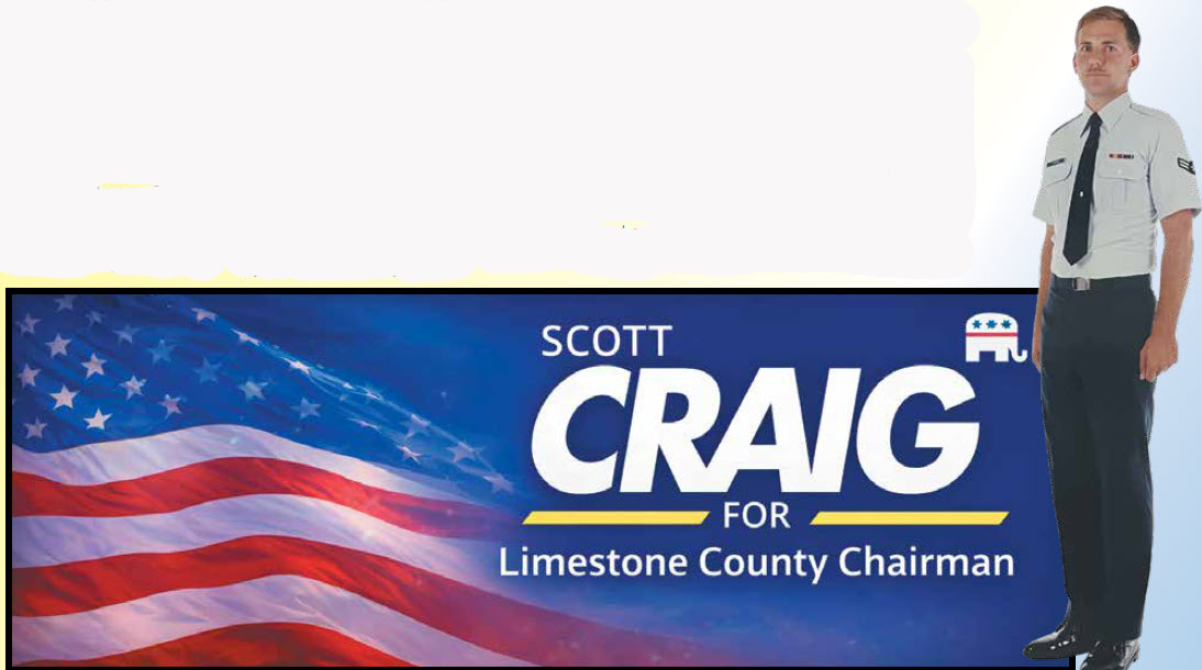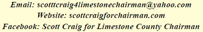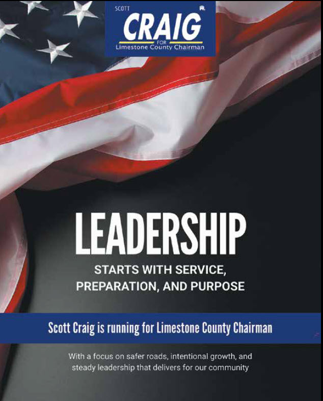 I ask for your vote on 19 May 2026 in the Republican primary. I’m not a career politician, I’m a normal citizen who is tired of hearing, “This is the way we have always done it.” Those days are past; that’s why roads are in the condition they are in. We must use the taxpayers’ dollars to put Limestone County first. Questionable spending needs to stop.