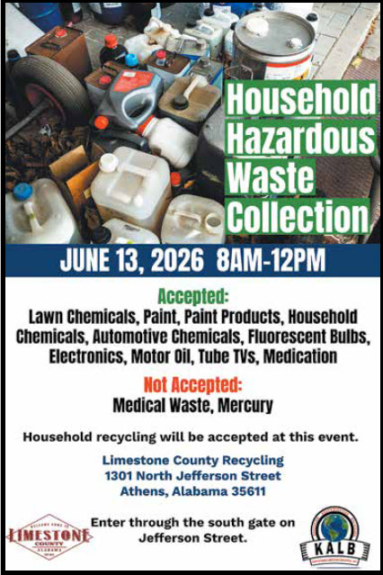 The Household Hazardous Waste Collection will be June 13 from 8 a.m. – noon. This year, things will be a little different. The event will be held at the Limestone County Recycling Facility, entering through the south gate at 1301 North Jefferson Street. We will have people, signs, and cones so you won’t miss us! Recycling will be open, so feel free to bring it all — paper, plastic, cardboard, aluminum cans, steel cans, motor oil, and electronics. We just ask that everyone remain in their vehicles at all times to keep the lines flowing. You will be directed through with volunteers to help unload at all points! You will drive through the Recycling building where most of your chemicals will be unloaded. Again, PLEASE DO NOT GET OUT OF YOUR VEHICLE!
