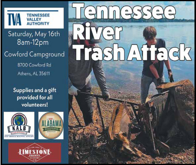 It’s finally that time of the year! Every spring, Keep Athens-Limestone Beautiful along with TVA hosts a Trash Attack at the river. This year, we are a little later than usual, but one good thing about it being late is it won’t be miserably cold. Over the past few years, we have removed over 10,000 pounds of litter from just three roads by the Tennessee River. And guess what…there is plenty more again this year. Volunteers will meet at the Cowford Campground on May 16 at 8 a.m. for directions, supplies, and a gift from TVA!