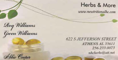 Next, we begin to help them focus on what changes they must make in order to move them back to where they want to be. Almost all physical problems can be reversed using a better mindset, drinking more water, and taking proper nutrition. It is now recognized worldwide that almost all disease is the result of nutritional deficiencies and dehydration. Over the last 25+ years we have helped thousands of people improve their overall health using these methods. Check us out by visiting us at Herbs & More in Athens, NHC Herbs Shop in Killen, our website www.nhcherbs.com or calling us for a free consultation at 256-757-0660.